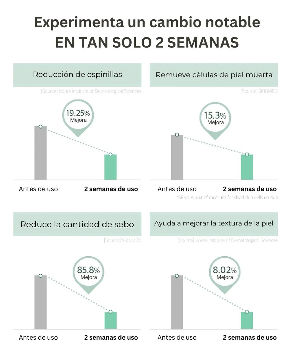 Lo ideal es aplicarlo de 2 a 3 veces por semana. Desde la primera aplicación sentirás la piel más suave e hidratada, y en pocas semanas notarás mejor textura y luminosidad.