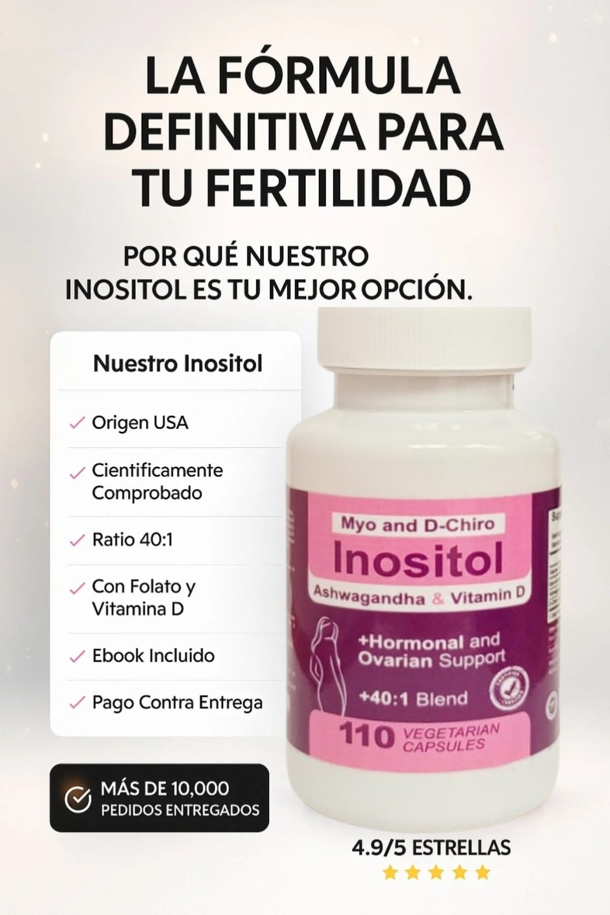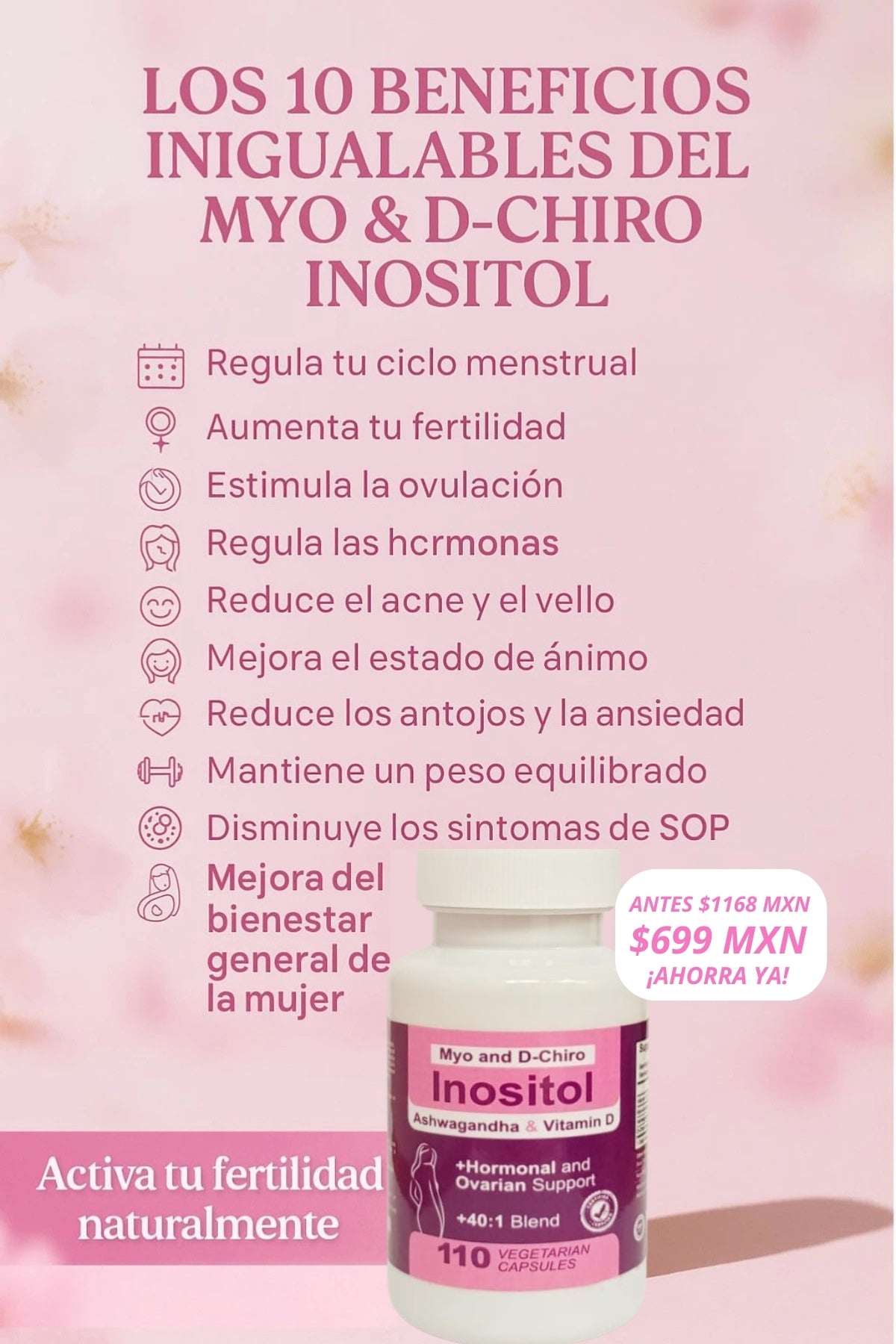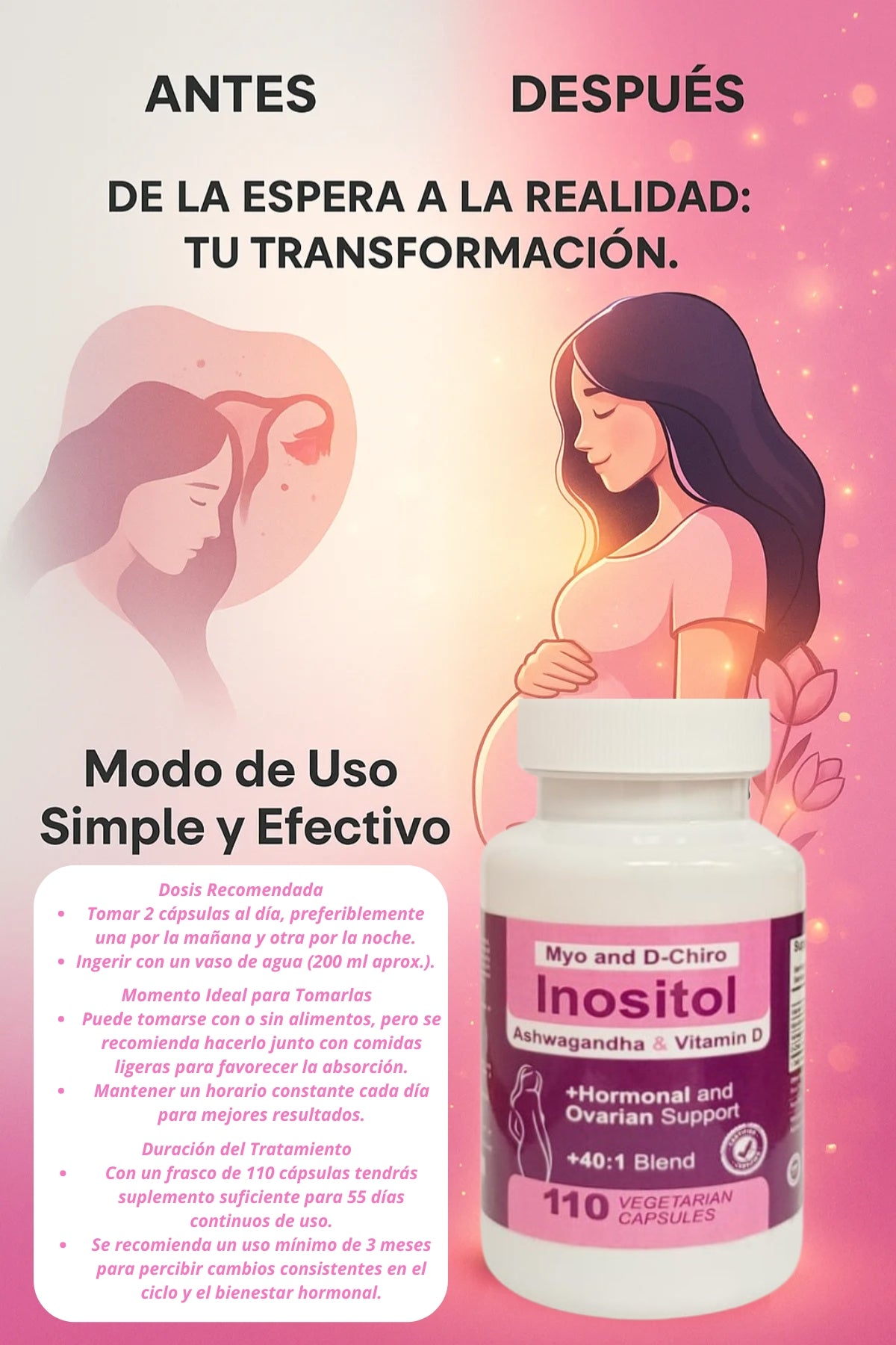 Cada cápsula combina Myo-Inositol y D-Chiro Inositol en proporción fisiológica 40:1, junto con Vitamina D y Ashwagandha. Esta fórmula está diseñada para favorecer la función ovárica, la regularidad del ciclo y el manejo del estrés, ofreciendo un soporte integral que otros suplementos no incluyen.