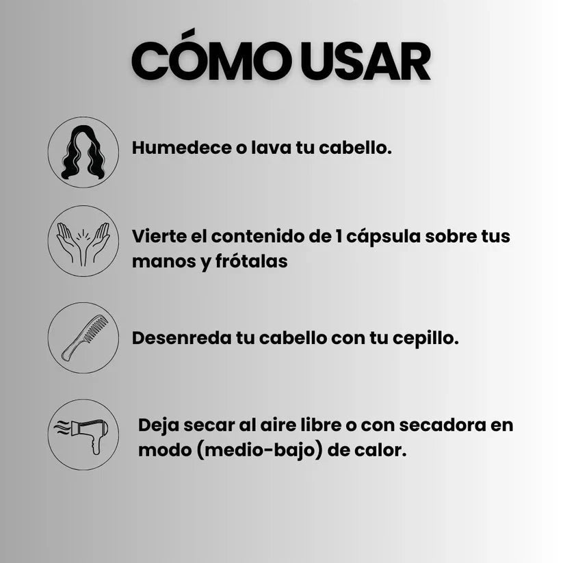 💆♀️ ¡Súper fácil! Solo tienes que cortar la cápsula con unas tijeritas o girarla suavemente, aplicar el contenido en la palma de tu mano y distribuirlo por todo tu cabello húmedo o seco, de medios a puntas. No se enjuaga.